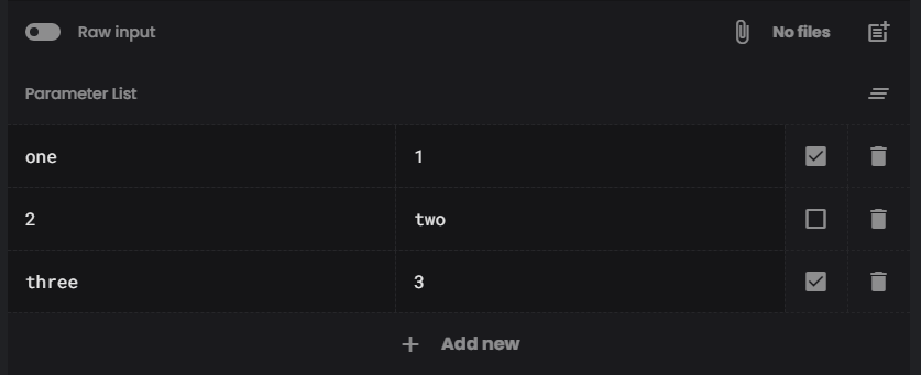 ff55132feat: toggler for parameters and headersaba6613refactor: move bodyParams to separate component + feat: input toggledcf21e4Merge branch 'main' into feat/input_togglere7655dffix: backward copaitability10a920fMerge branch 'main' into feat/input_togglerbf59ba5Merge branch 'main' into feat/input_toggler9d2fc1eFixed issue with imported active prop mutations📊 Changes