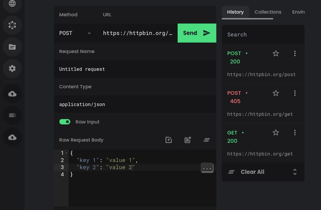 POST,PUT, orDELETEyou can add request body from request section. And it can be done in two ways. Key-value pairs and Raw input.This feature enable syncing both of them. Whenever you add a key-value pair - it should reflect in Raw input and when you add a Raw input (JSON object) it should reflect in key-value pair.