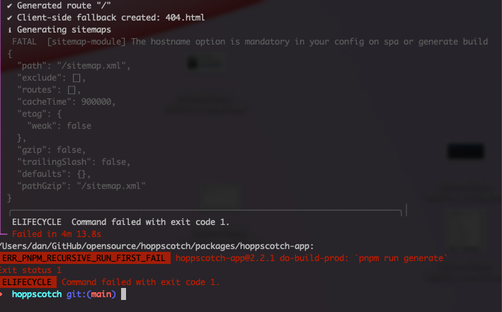 pnpm run generate, it takes a while and seems to be succeeding, but when it reaches the sitemap generation step it fails with the error:FATAL [sitemap-module] The hostname option is mandatory in your config on spa or generate buildI have attached a screenshot of the error.