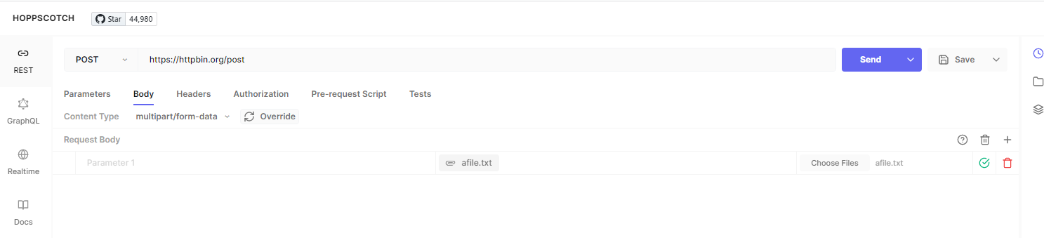 In the debugger, when using Hoppscotch.io, it looks like it doesn't actually send a file