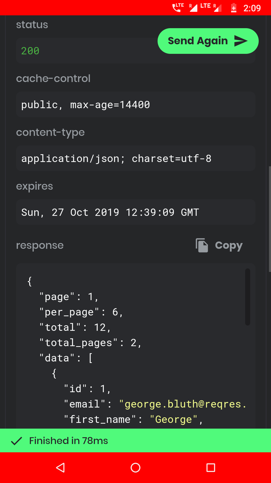 Display the time difference from the start of making a request to the end of geting the response. The unit should be in milliseconds (ms)