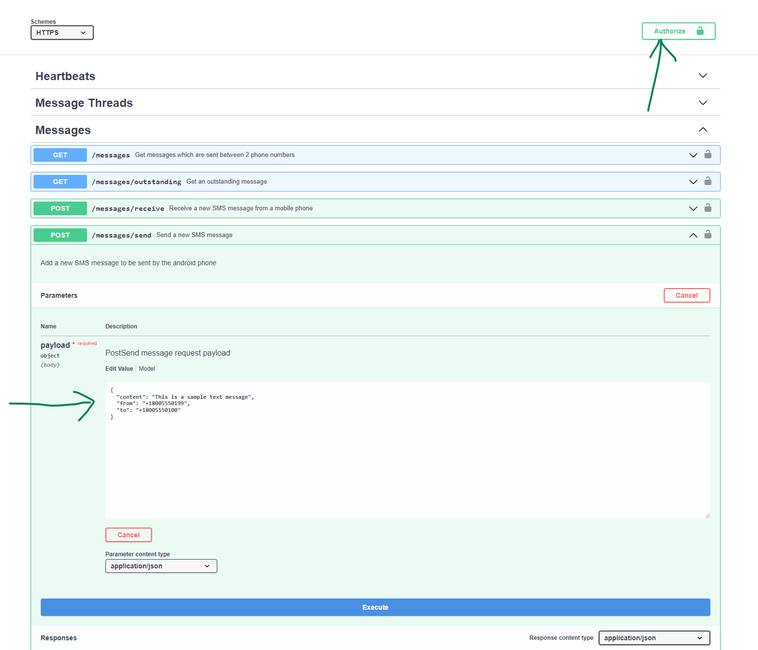 POSTrequest. Also, the Content-Type should beapplication/json.You could try it out using the swagger playground here https://api.httpsms.com/index.html#/Messages