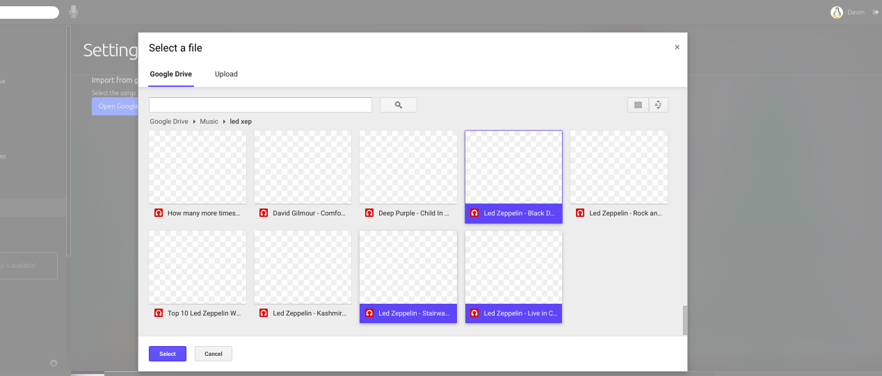 Importsidebar title withGoogle Driveas an optionOn the Import page we can use Googles file picker to authenticate ourself and select individual or multiple tracks/directories.