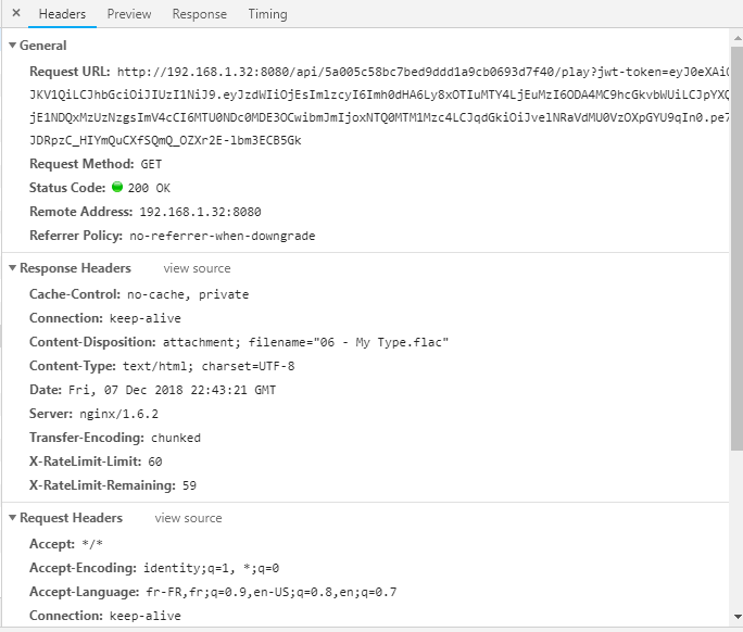 Content-Type is set to text/html when it's a Flac file.