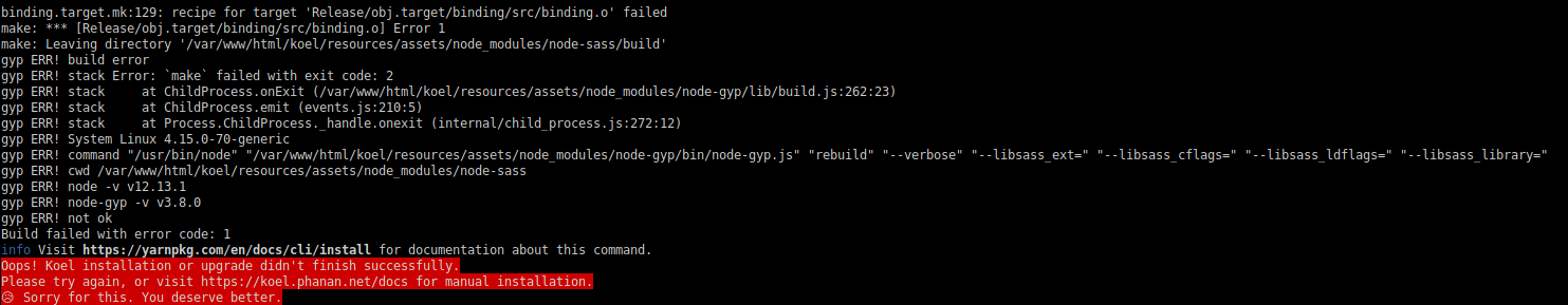 I have a Ubuntu 18.04 Server and wanted to install koel, after when runing php artisan koel:init, after i set the database i get the yarn no option --colors error.