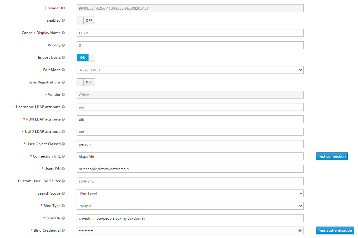 Probably doing something wrong, however when I attempt to set up Keycloak to pull users in, I wind up with the following error message when attempting to test authentication with the admin user. I can successfully get Keycloak to connect, however.