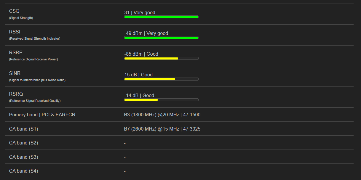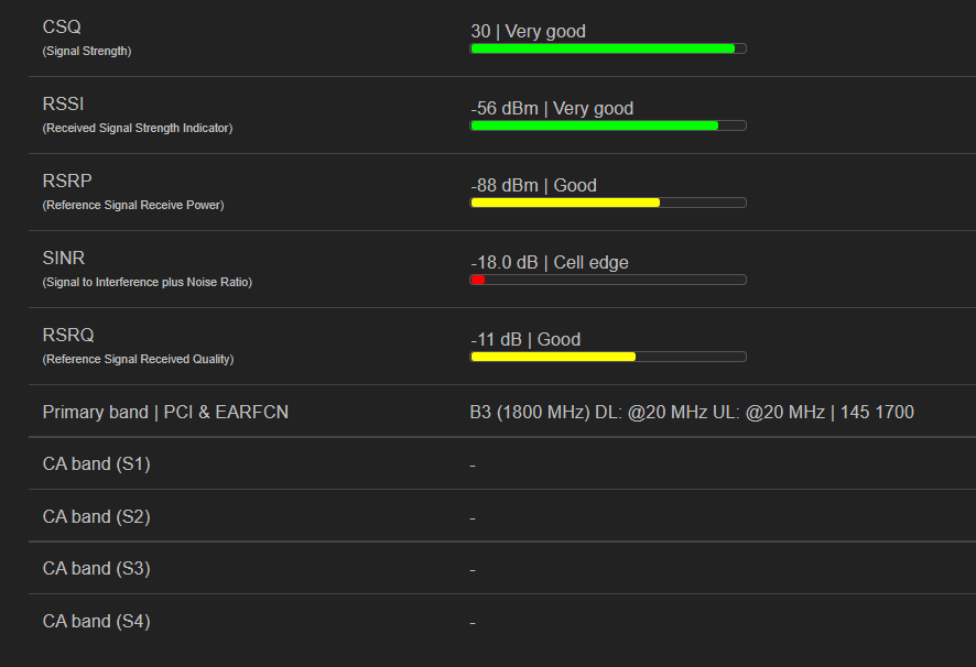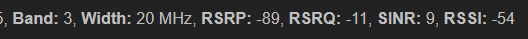 { "connt":"-", "conntx":"-", "connrx":"-", "modem":"Quectel EP06", "mtemp":"34 °C", "firmware":"EP06ELAR04A05M4G", "cport":"/dev/ttyUSB7", "protocol":"ecm", "csq":"31", "signal":"100", "operator_name":"KYIVSTAR", "operator_mcc":"255", "operator_mnc":"03", "mode":""LTE_A BAND 3" / "LTE BAND 7"", "registration":"1", "simslot":"", "imei":"868xxxxxxxxxxxxxx", "imsi":"255xxxxxxxxxxxxxx", "iccid":"893800xxxxxxxxxxxxxx", "lac_dec":"31764", "lac_hex":"7C14", "tac_dec":"", "tac_hex":"-", "tac_h":"", "tac_d":"", "cid_dec":"61646112", "cid_hex":"3ACA520", "pci":"", "earfcn":"", "pband":"", "s1band":"", "s1pci":"", "s1earfcn":"", "s2band":"", "s2pci":"", "s2earfcn":"", "s3band":"", "s3pci":"", "s3earfcn":"", "s4band":"", "s4pci":"", "s4earfcn":"", "rsrp":"-85", "rsrq":"-12", "rssi":"-52", "sinr":"-17.4" }@4IceG commented on GitHub (Dec 20, 2022):