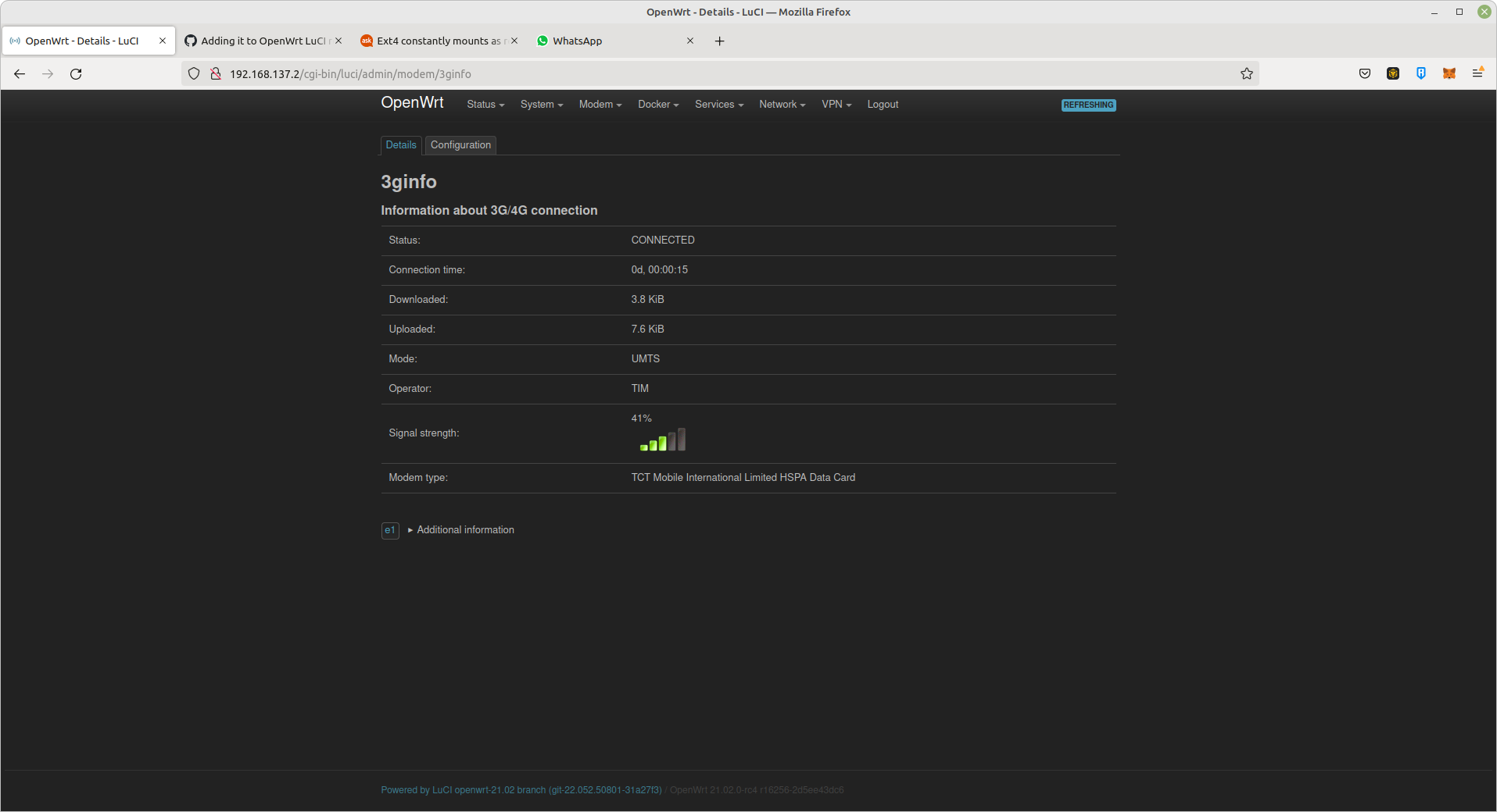 Working like a charm! btw its a old old ollllllld modem alcatel x090s, im looking for a simple 4.5g usd dongle modem can you advise me some ? man please put 3ginfo at openwrt opkg repository it works so well!! dzięki dzięki !