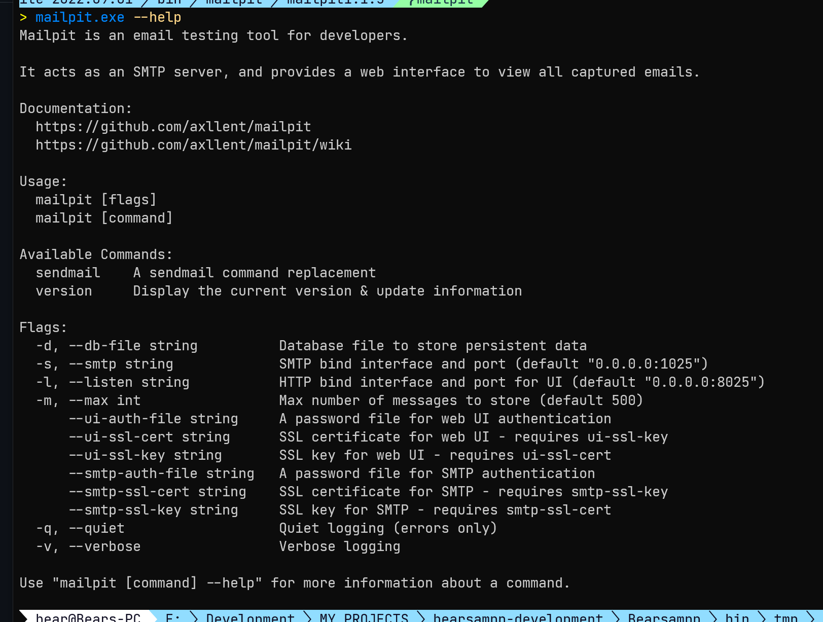 --listen 127.0.0.1:%d --smtp 127.0.0.1:%d --db-file "%s/mailpit.db"The command line flags are documented in the wiki if you need more information.