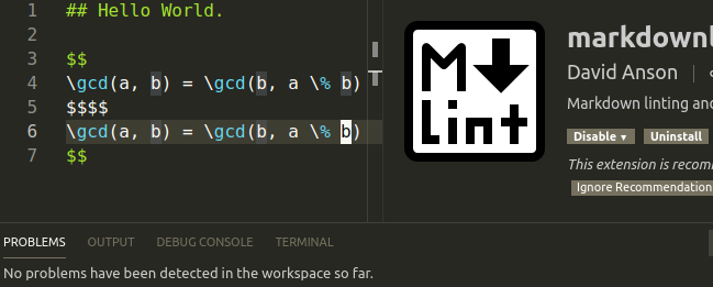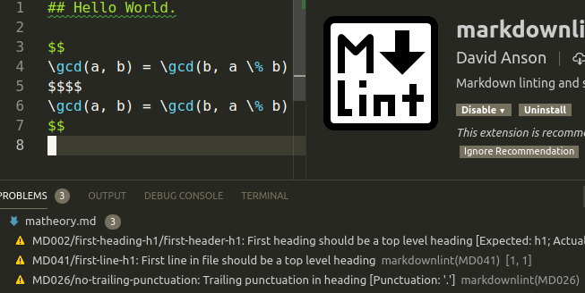 Also, please note that this project doesn’t recognize math blocks by default – though the VS Code markdownlint extension does.