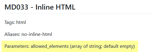 By the way, “disabling” a rule turns it off. Retreading your issue, it seems you want to “enable” MD033 (and configure it).