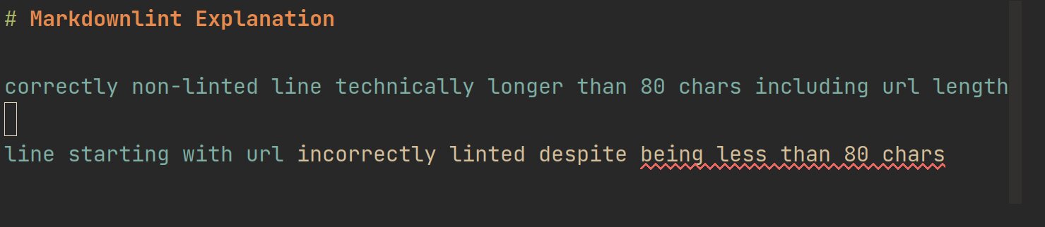 My mistake, MD013 is off by default in the web demo. Here is your example with it enabled and reporting: https://dlaa.me/markdownlint/#%25m%23%20Markdownlint%20Explanation%0A%0A%3C!--%20markdownlint-enable%20MD013%20--%3E%0A%0A%5Bcorrectly%20non-linted%20line%20technically%20longer%20than%2080%20chars%20including%20url%20length%5D(https%3A%2F%2Fakfdjajdf.asdfljbadfjladsfadsjfbafbjhbflajdf)%0A%0A%5Bline%20starting%20with%20url%5D(https%3A%2F%2Fwiki.archlinux.org)%20incorrectly%20linted%20despite%20being%20less%20than%2080%20chars%0A
