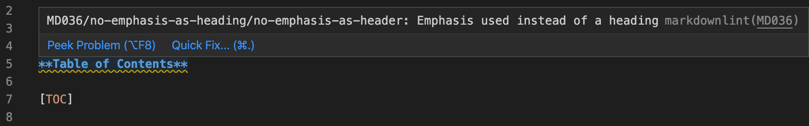 [TOC]macro for table of contents generation (https://support.atlassian.com/bitbucket-cloud/docs/add-a-table-of-contents-to-a-wiki). I don't want to have the ToC line in list itself, hence simply making it bold. But then there is a warning frommarkdownlint. See below. A bit of catch 22.On the another hand, if https://github.com/DavidAnson/markdownlint/issues/295 is implemented, then it'll solve this one also.