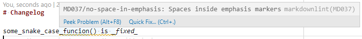 The line is rendered correctly, but markdown triggers a "MD037/no-space-in-emphasis" warning for the