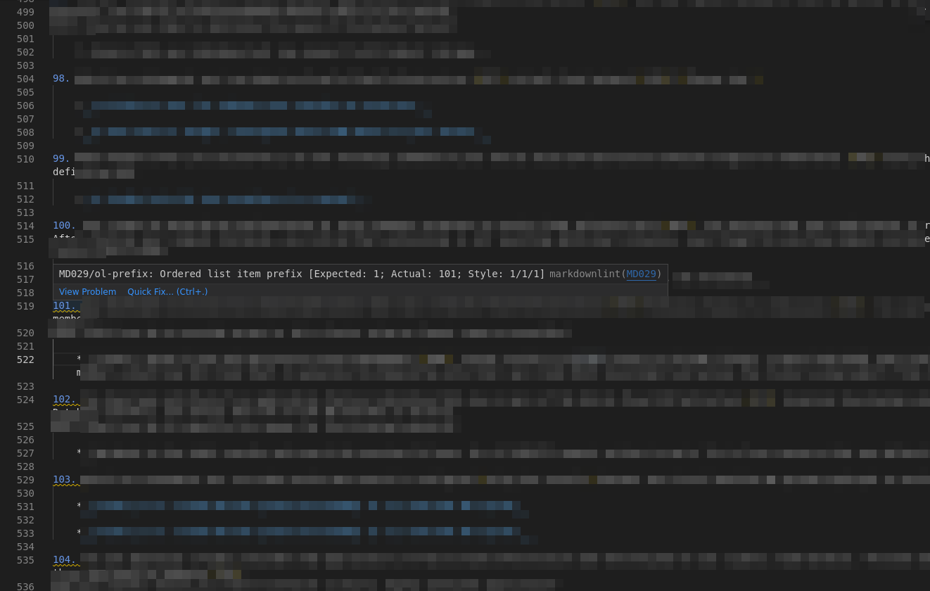 The content in item 100 (and later) needs to be indented an additional space in order to start in the proper column. As written, it's doing the equivalent of this which ends the first list: https://markdown-it.github.io/#md3=%7B%22source%22%3A%221.%20Text%5Cn%5Cn%20%20%20Text%5Cn%5Cn2.%20Text%5Cn%5Cn%20%20Text%22%2C%22defaults%22%3A%7B%22html%22%3Afalse%2C%22xhtmlOut%22%3Afalse%2C%22breaks%22%3Afalse%2C%22langPrefix%22%3A%22language-%22%2C%22linkify%22%3Atrue%2C%22typographer%22%3Atrue%2C%22_highlight%22%3Atrue%2C%22_strict%22%3Afalse%2C%22_view%22%3A%22html%22%7D%7D
