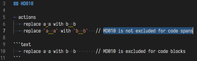 markdownlint.configis as follows:The problem is that the tab character in the code span will be recognized as an error: