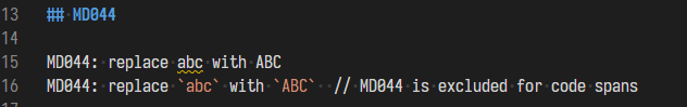 PS: MD044 will be excluded for code spans when "code_blocks" is "false".