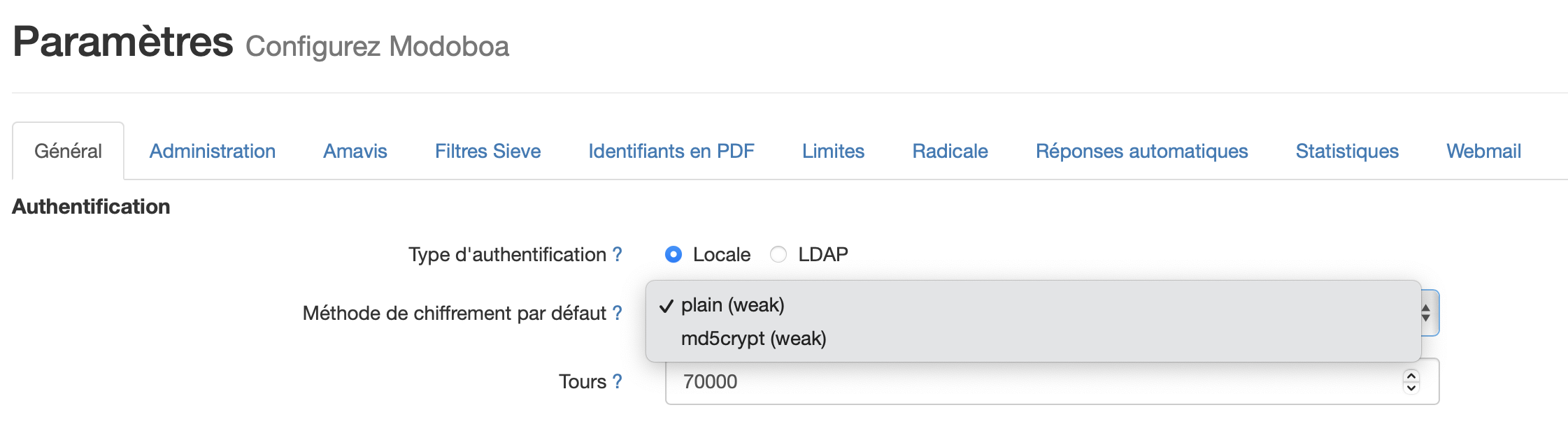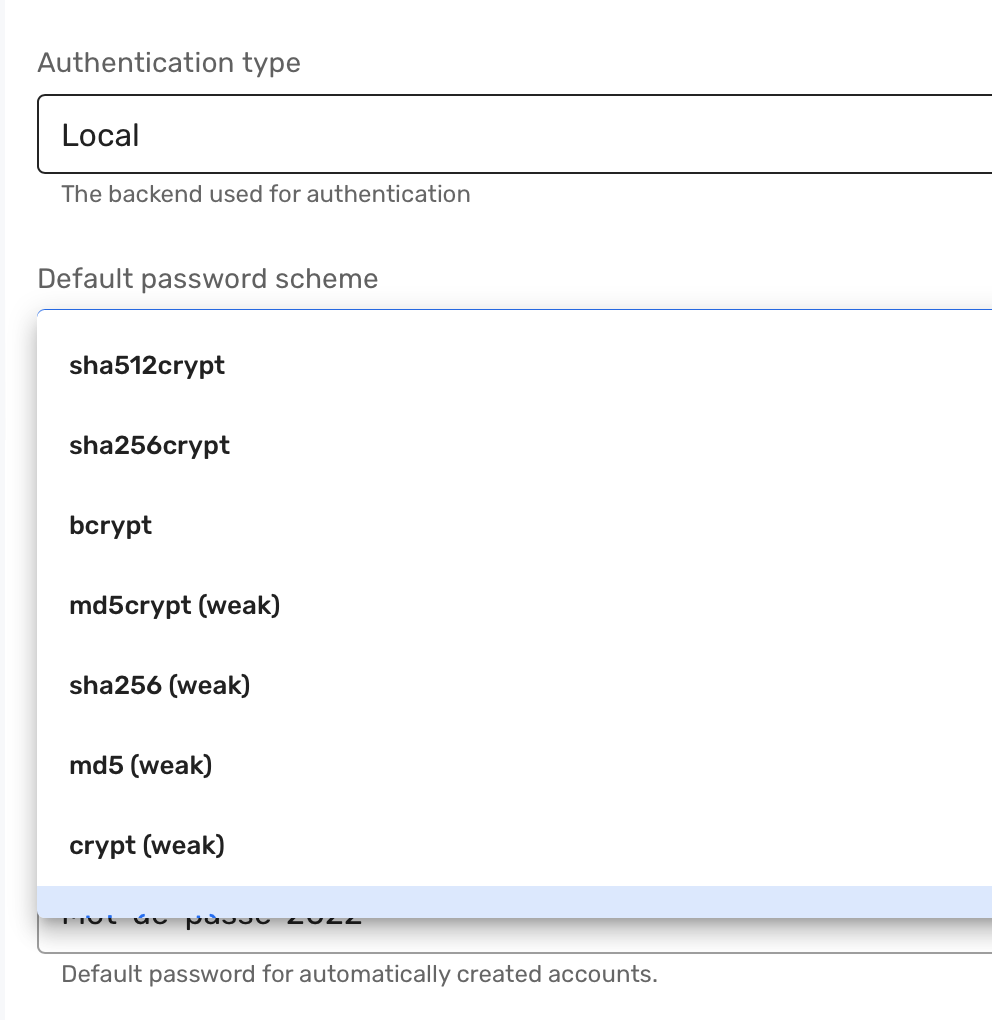 At the exit of the installation, the encryption methods are missing in the administration interface v1 for "Default password scheme". In the v2 interface, the methods are all present but the modification of the default method is not saved when it is changed.