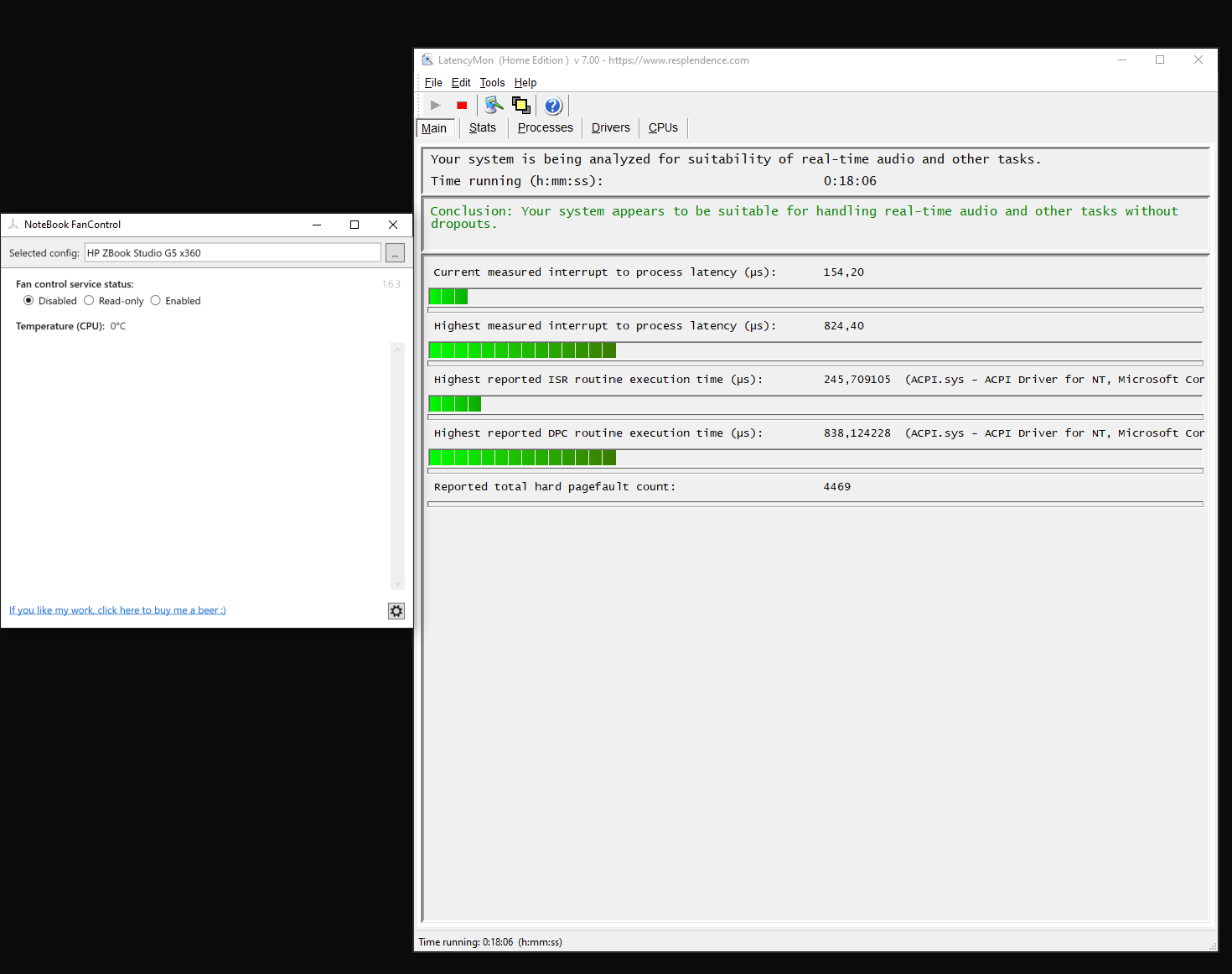 Running HP zBook Studio G5 x360 2018 with i7 8850 6-core 32 GB RAM and 2x 1TB SSD drives. Using primarily for audio creation and real-time performance after years with a MBP. Struggled with clicks and pops caused by DPC Latency and finally found a good method by disabling turbo, abandoning my older but fine RME Fireface 400 for a USB RME UCX and running CPU at fixed maximum clock 2.6 GHz. However the fans as programmed by HP kick in at 50 and are super loud and whiny even at 60 C the disturbance is completely unuseable in live recording settings, so it is a big disappointment to have made the plunge into the Windows based hardware world. So thrilled to finally discover Notebook Fancontrol and a working config (HP zBook Studio G3). However, as soon as the service is active in either read-only or enabled mode, LatencyMon shows a big increase in latency events which are mirrored by audible breakdowns in the real-time audio. I am aware this reopens an old issue from a couple of years ago, but I guess that had to do with a non-working config. Any help tracing this would be most kindly appreciated. It seems ACPI.sys is the affected process.