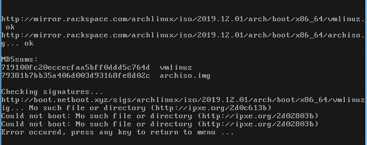Was trying to boot into the ArchLinux image and it fails to verify the signature and then stops