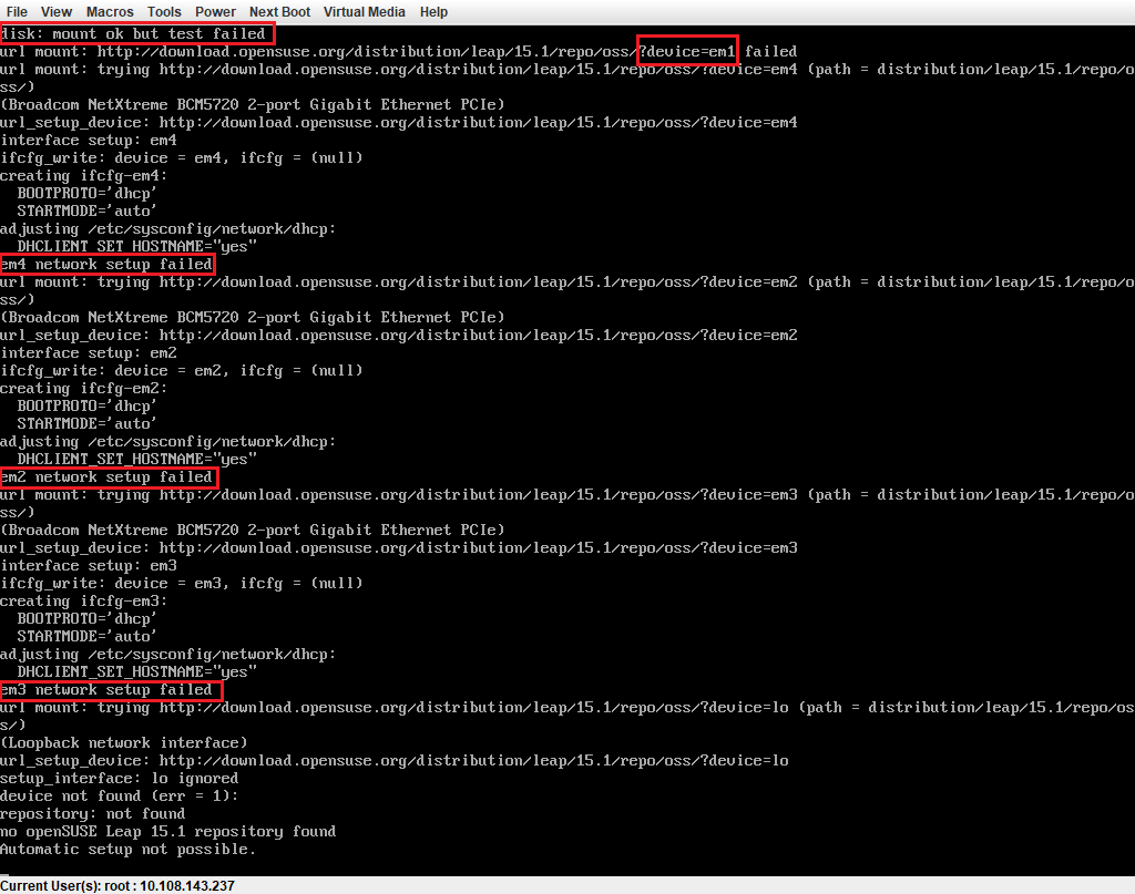 Here's the 'Ctrl+Alt+F3' log at the same time. Notice that em1 network seems to be up...but its saying "mount ok but test failed"