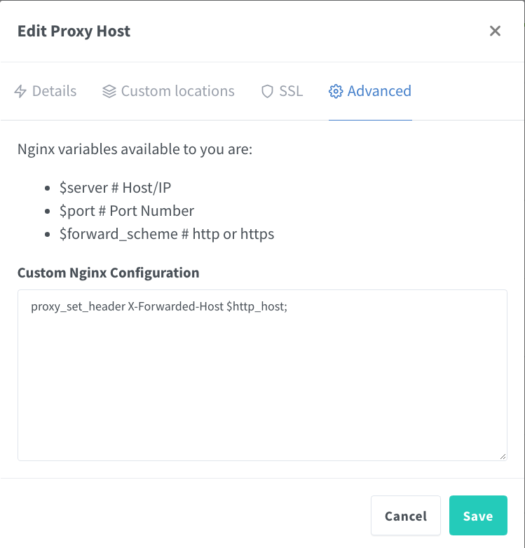 proxy_set_header X-Forwarded-Host $http_hostin my advance config it doesn't take effect. After looking at the saved config file I found that the statement is put outside of the