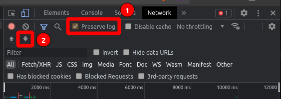 Otherwise please open the "network" tab in your web console, and check the "Preserve log" checkmark (1). Try to log in again. After your issue occurred, click the download button (2) to download it as a har file. Then please provide this file to me. Since this file contains sensitive information (the domain name, your username and your password), you should upload it to a file hoster where the file expires after a short period of time like file.io where the file is deleted after a single download.