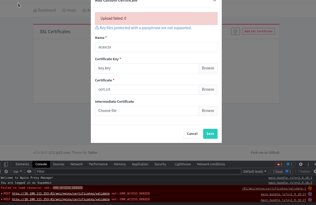 [GH-ISSUE #2191] Custom Certificate Import not working- Upload Failed:0 #1568