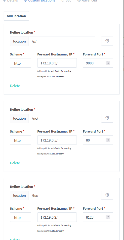 Using a LAN IP-Address as your domain name, is not correct. It cannot be resolved by DNS. And what is 172.19.0.4 ? You WAN-IP? Also, why did you add a slash ( / ) following the IP-Address in the Custom locations? I believe that's clearly also wrong.