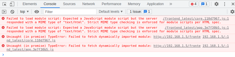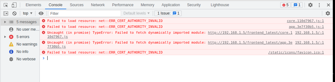 add_header Content-Security-Policy upgrade-insecure-requests;to the location configuration turns the error into this:Uncaught (in promise) TypeError: Failed to fetch dynamically imported module:Not sure this is relevant or expected, don't know what i'm doing