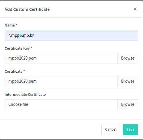 I'm trying to make use of my organization's own certificate in NPM, but for some reason I'm not able to upload it, I go through the web interface and add the certificate as shown in the image below: