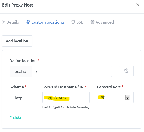 in my case, i use "php7/tvm" and port 80, because its a docker network where nginx sees the other container via its name, but you should be able to use whatever you like. so a location with "/" and a DNS/IP/Path like "xxx.duckdns.org/service1" and Port "8081" should work. at least it did for me.