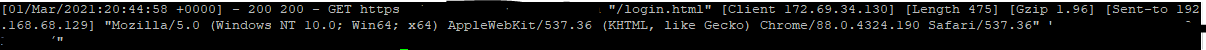 real_ip_header CF-Connecting-IP;set:[03/Jun/2021:20:49:46 +0000] - 200 200 - GET https meh.example.domain.tld "/login" [Client 141.101.105.125] [Length 3541] [Gzip -] [Sent-to 192.168.1.9] "Mozilla/5.0 (iPhone; CPU iPhone OS 14_6 like Mac OS X) AppleWebKit/605.1.15 (KHTML, like Gecko) Version/14.1.1 Mobile/15E148 Safari/604.1" "-"Where as 141.101.105.125 is: one of Cloudflares proxy IP addresses.