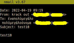 Κάποιοςμεμακρύόνομα Καιμακρύεπώνυμο <longname.longsurname@somemail.org>.The above commit should fix the issue. However, in order for it to work on already received emails one needs to delete old cached headers that might've been parsed wrongly using a previous nmail version. This can be done with: