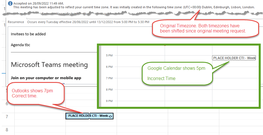 Outlook is correctly showing the meeting at 7pm, however the synchronisation is showing the meeting at 5pm.