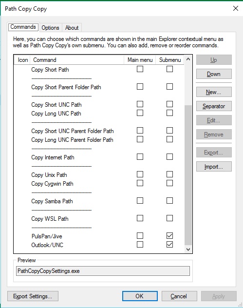 Path Copy Copy reads settings from registry keys under Software\clechasseur\PathCopyCopy. There's a global copy of this key in HKEY_LOCAL_MACHINE and one for each user in HKEY_CURRENT_USER. Settings in HKCU override those in HKLM.