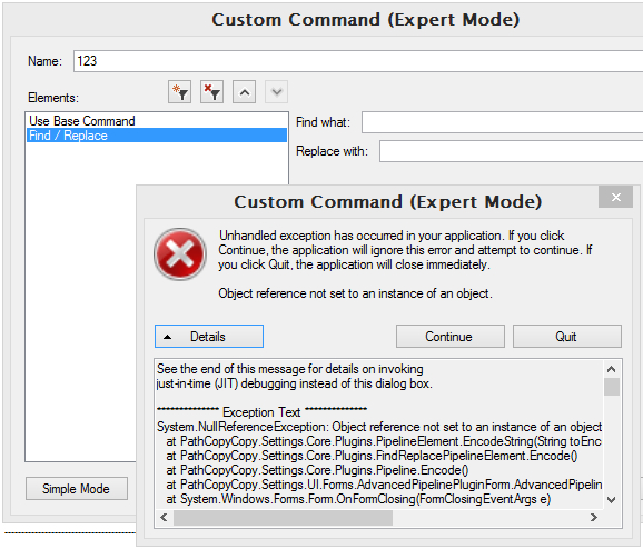 If I use the "Expert Mode", add a new "Find / Replace" element using no strings and press the "OK" button, this window appears: