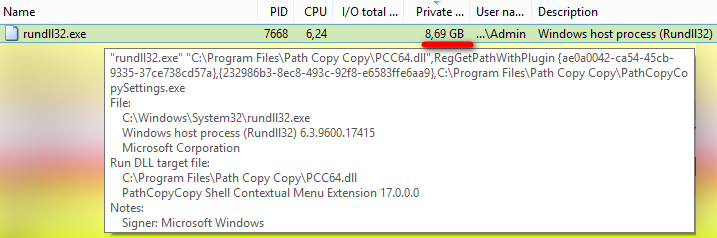 Under that circumstance, the contextual menu will start being unresponsiveness and I couldn't access the program's settings anymore, without first deleting the faulty rule out of registry. After pressing the "Close program" button from the Windows' message, the memory over consumption ceased.