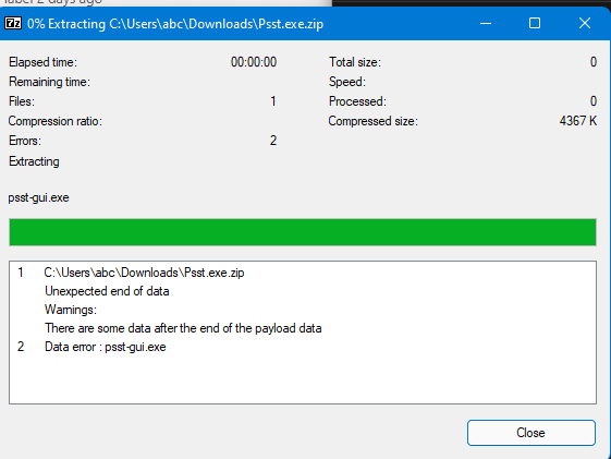 7 zip was able to (I think partially) unzip the file, but even then when I try to run the psst-gui.exe file, I get the following error: