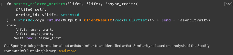docs.rswith the reqwest client. Unfortunately, since that uses async-trait, the function signatures are horrifying:So this just enables