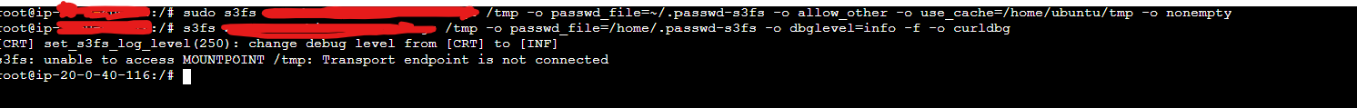 @tapanjo92 It probably failed to mount /tmp. try mounting the endpoint to a different folder. /tmp is unlikely to be empty and you have option nonempty and chances are it's already a mount for something else.