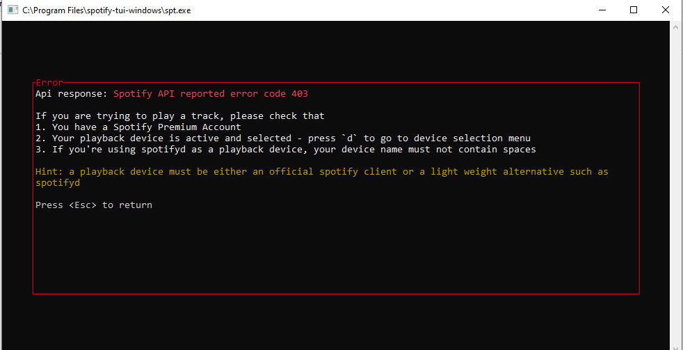 spotify-tui, although I have selected my phone within the list of devices, it is still not playing it on my phone, but rather calling the same error 403. Btw, is Spotify Premium necessary for playing songs on my phone from tui?@MrPoliteGrizlyM commented on GitHub (Feb 29, 2020):
