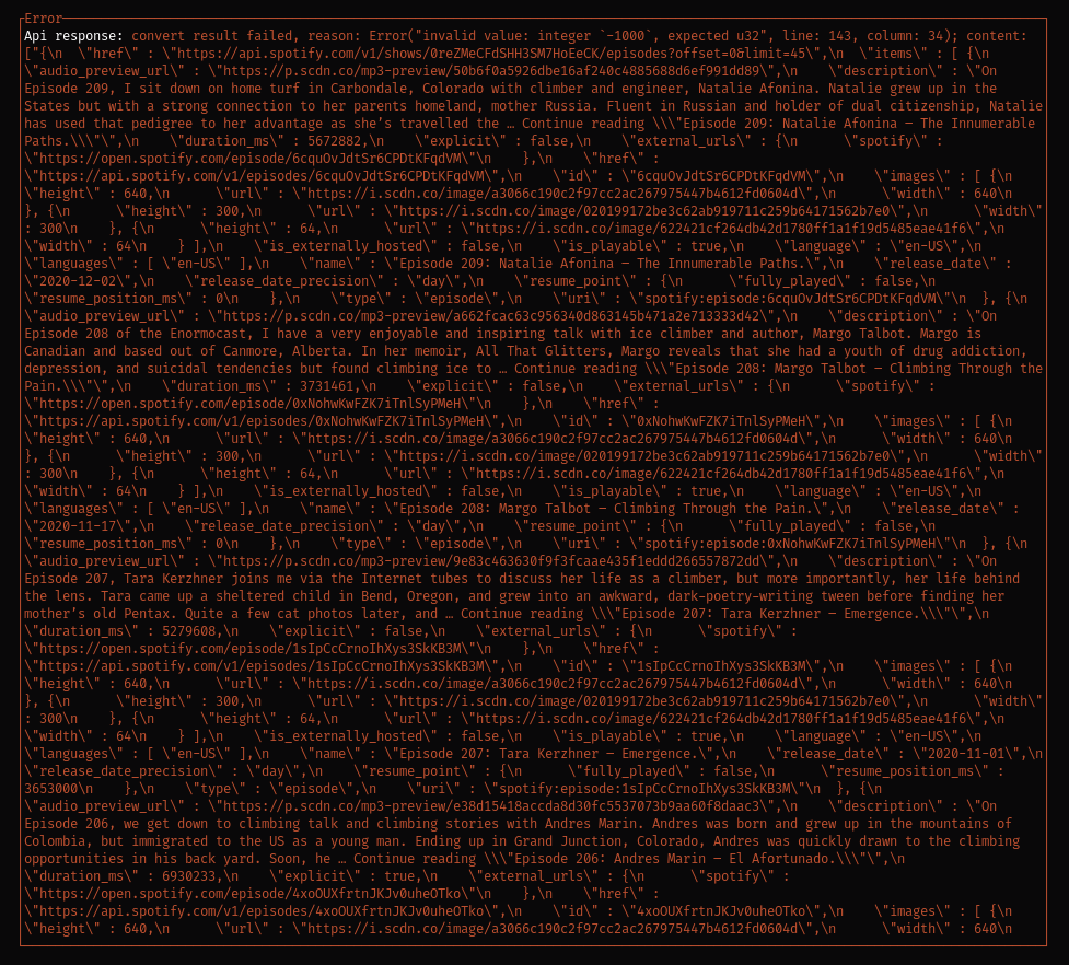 It looks like something to do with the JSON data for certain podcasts isn't converting properly.