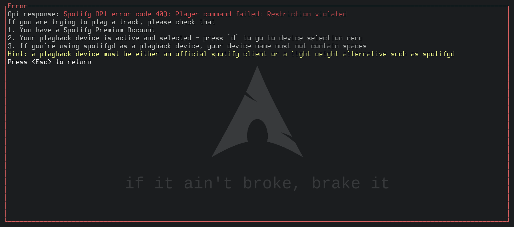 Original GitHub issue: https://github.com/Rigellute/spotify-tui/issues/832