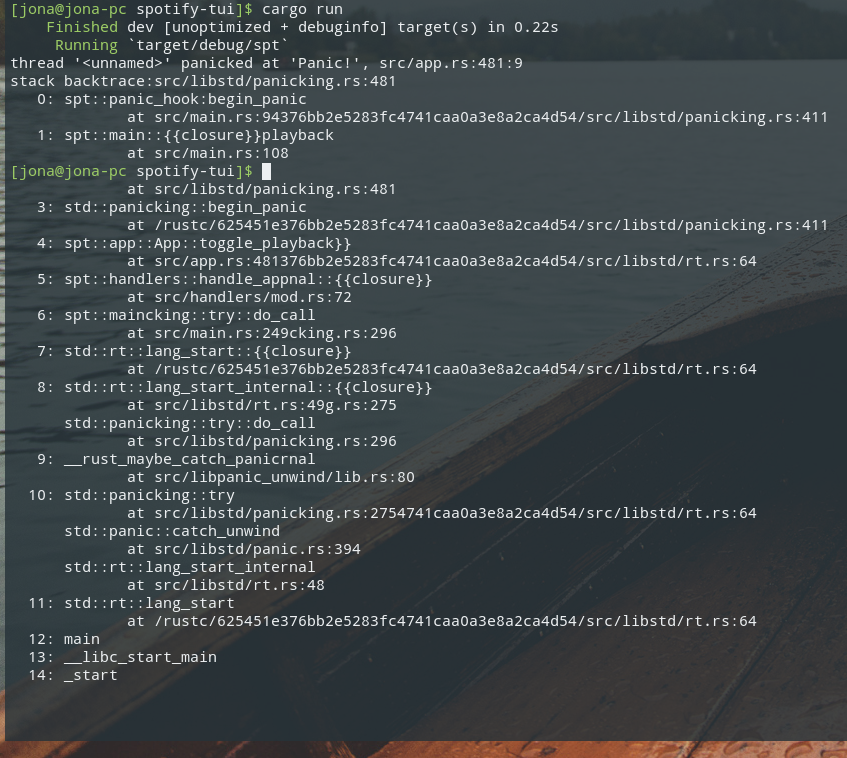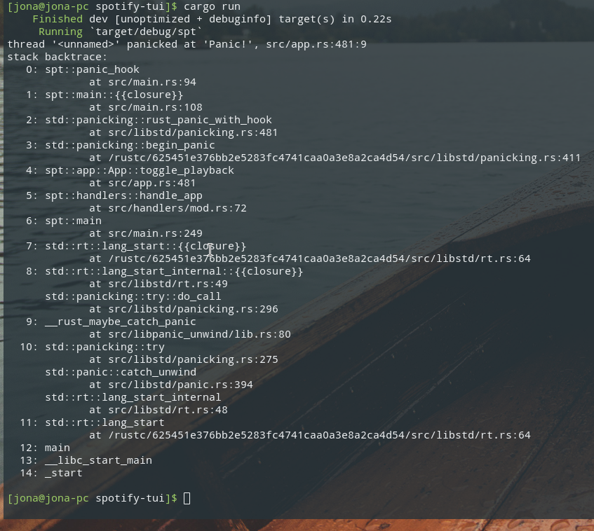 RUST_BACKTRACEenvironment variable. It uses the workaround suggested here fdehau/tui-rs#177.Unfortunately there is still an issue with the cursor placement after the crash where it is placed into the stacktrace output if the app was not run from the last line in terminal. Demonstration: