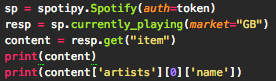 When using current_user_playing_track(), current_playback() and currently_playing() all 3 responses return a dict which is fine. However, the issue lies when I try to pull information about the artist.