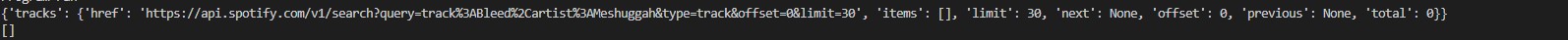 When attempting to execute .search(), the 'tracks' list in the response object is sometimes completely empty for some artists, even though the query seems identical to the one provided by Spotify's URL query builder. The below example uses "Meshuggah", but this also occurred with "Sequoia" (track) and "Protest the Hero" (artist).