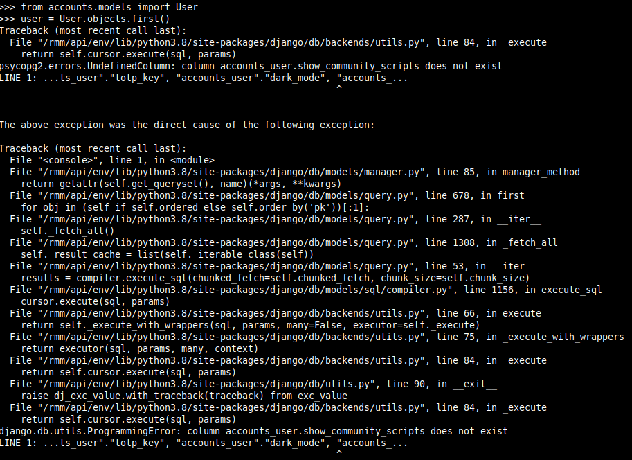 Ok I try to change my password, so I try to do procedure for that, but when i execute user = User.objects.first() This is the error: