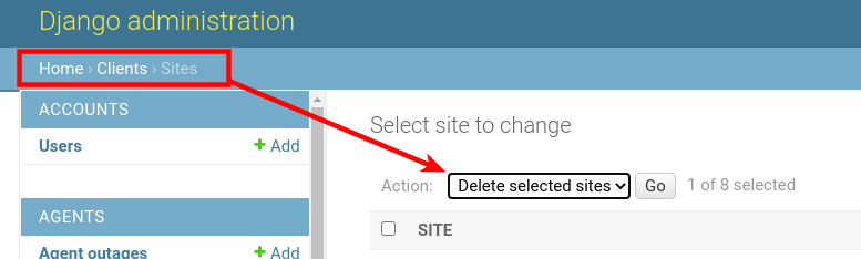 You should not really be using the django-admin otherwise cuz its basically editing the database directly so very easy to break things, but in this case just for deleting clients or sites it's ok