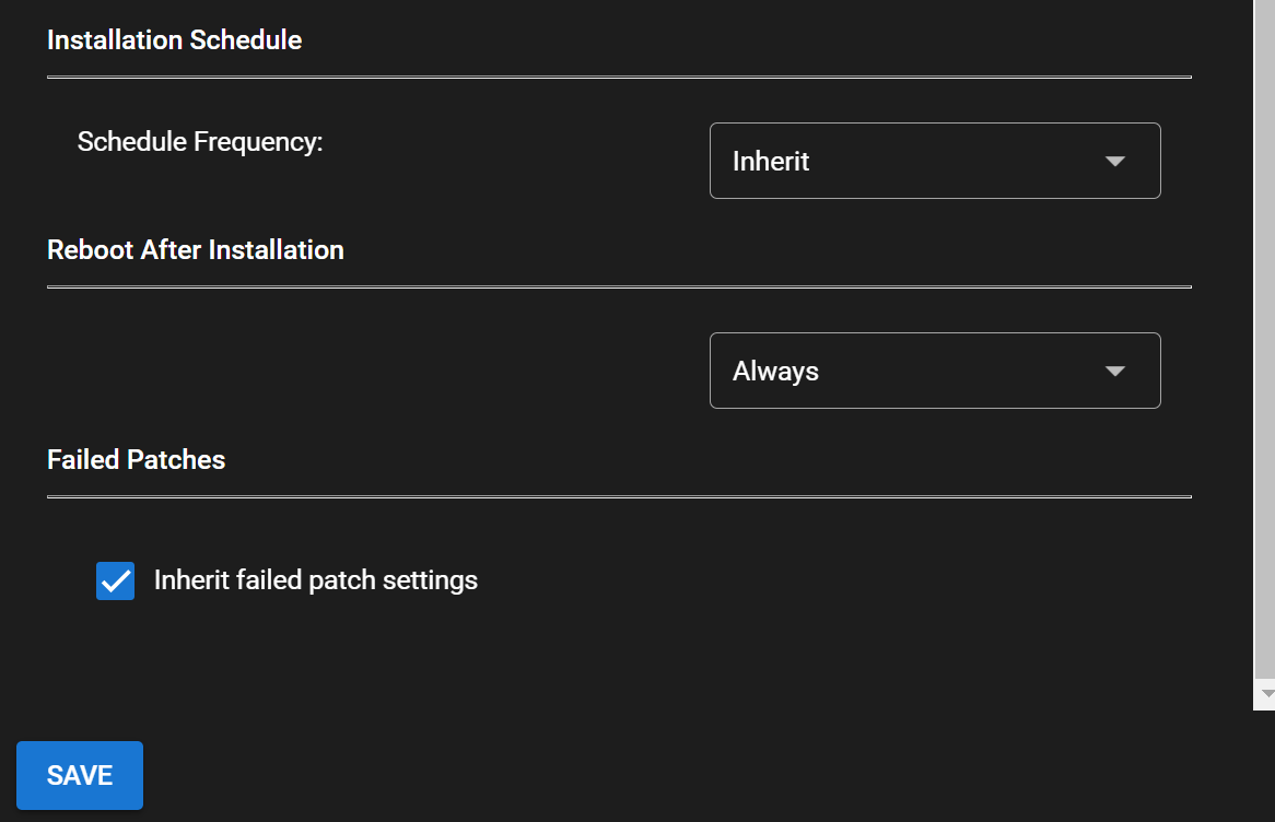 The schedule time is controlled by the schedule frequency. By default, the agent inherits all patch settings from an automation policy